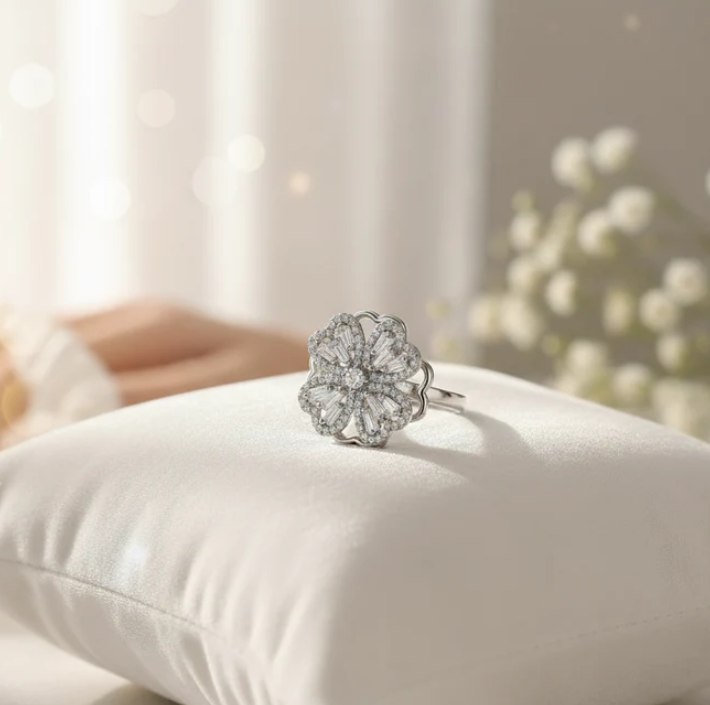 Sıradanlığa veda edin! Bu yüzük, sadece bir takı değil, elinizde açan ışık dolu bir sanat eseri. Merkezindeki parlak pırlanta ışıltılı zirkon taşlar, adeta bir çiçeğin taç yaprakları gibi özenle yerleştirilmiştir ve her hareketinizde etrafa büyüleyici bir ışıltı saçar.
