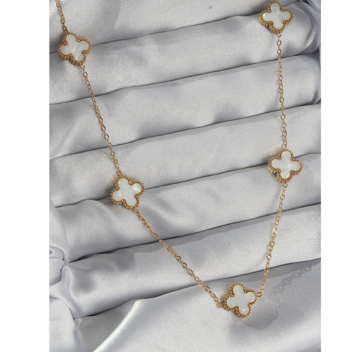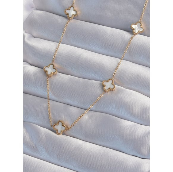 Işıltılı altın zincir üzerinde, sedefin büyüleyici beyazlığıyla bezenmiş yonca motifleri. Şans ve stilin mükemmel buluşması.