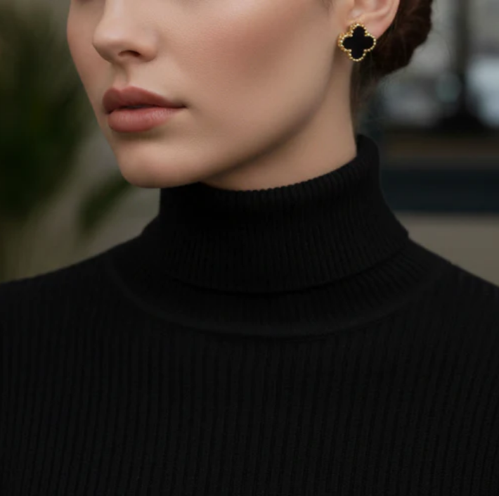 Dört yapraklı yoncanın iyi şans fısıltısını altın detaylarla birleştiren ikonik tasarım. Siyah oniksin derin asaletini taşıyan bu küpeler, sade bir dokunuşla tüm bakışları üzerinize çeker. Gündüzden geceye, stiline değer katmak isteyenler için mükemmel seçim.